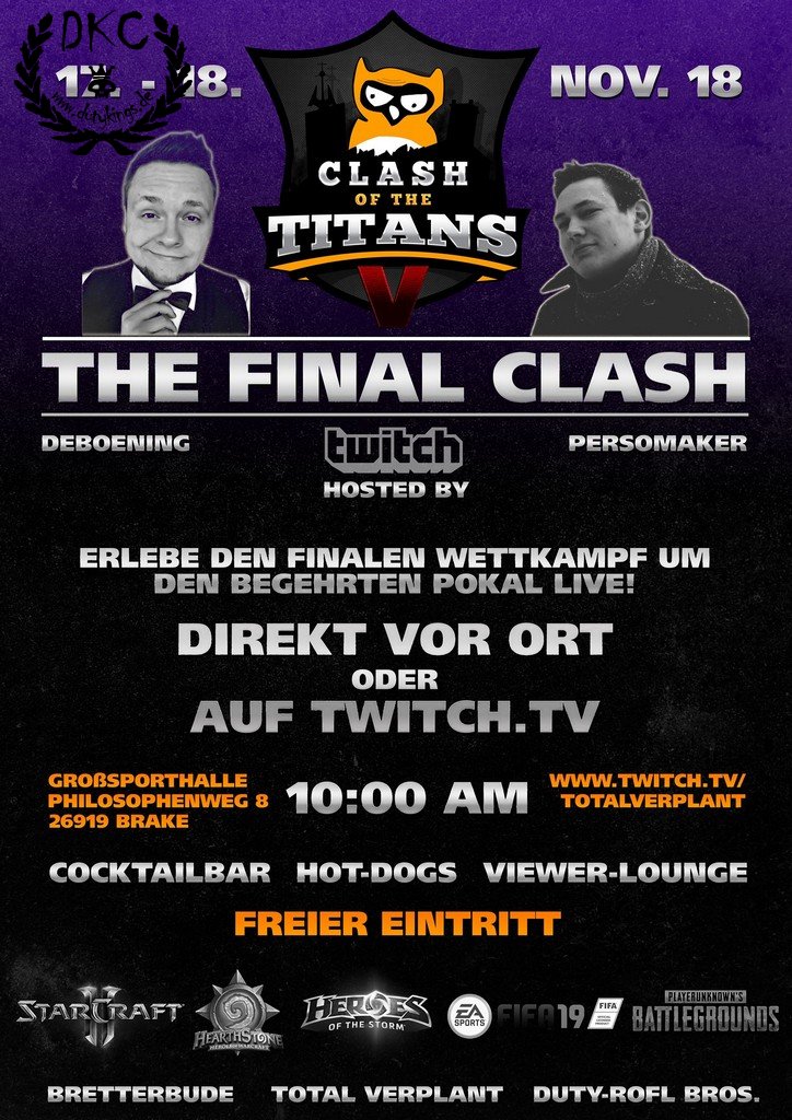 Clash of the Titans 5 sollte der finale COTT werden, ob das so ist, wird man noch sehen. Vielleicht wird er ja auch von der bald entstehenden Duty Olympiade abgelöst... Ich war leider nicht da, aber habe ein paar Fotos als Eindrücke per Whatsapp bekommen. Vielleicht werden die Fotos der Orga noch nachgereicht. Gewonnen haben wohl verplant, vor den Duty-roflern und Bretterbude, was ich aber nicht ganz sicher sagen kann.